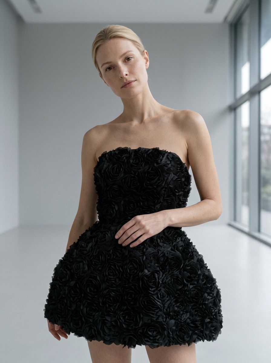Modern ve iddialı tarzı bir araya getiren bu özel tasarım siyah mezuniyet elbisesi, unutulmaz bir gece için dikkat çekici bir görünüm sunuyor. Tamamı üç boyutlu gül aplikeleriyle kaplanan tasarımı, klasik siyah tonunu romantik ve couture bir dokunuşla yeniden yorumluyor.