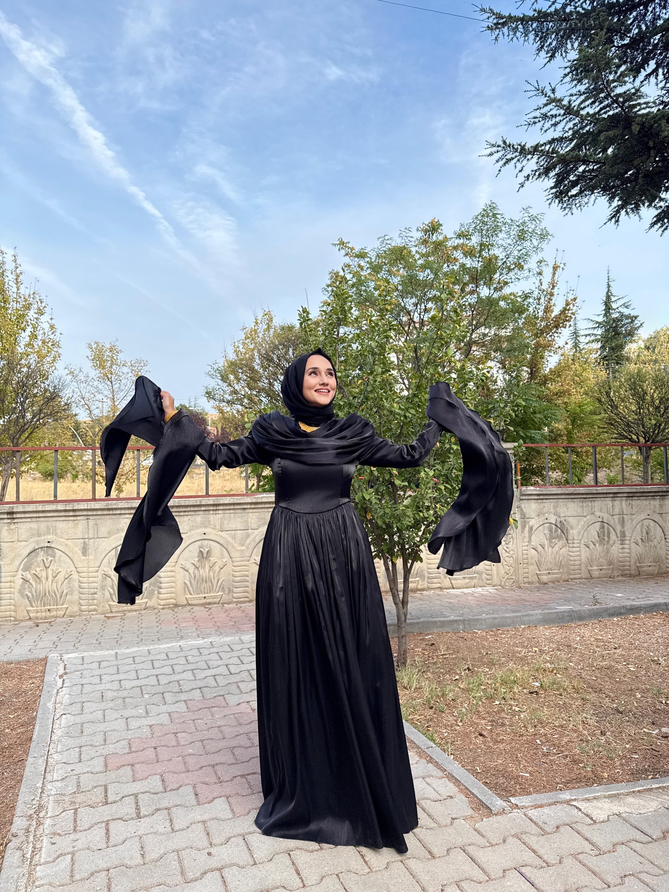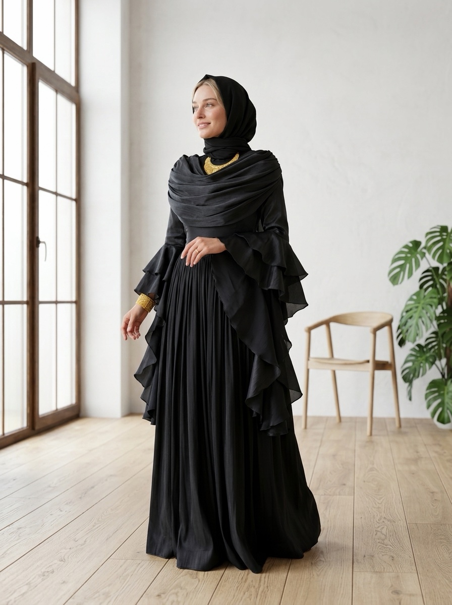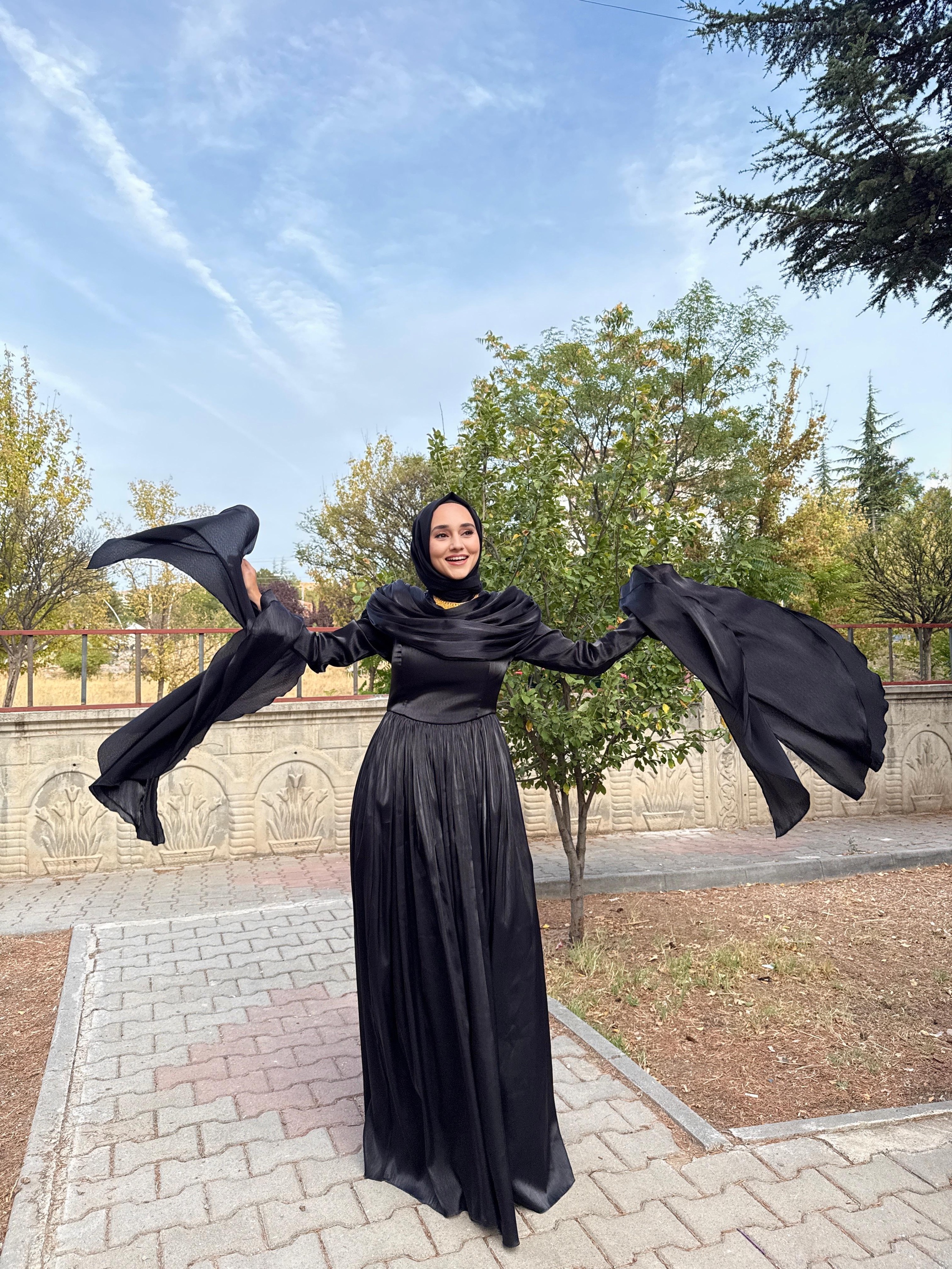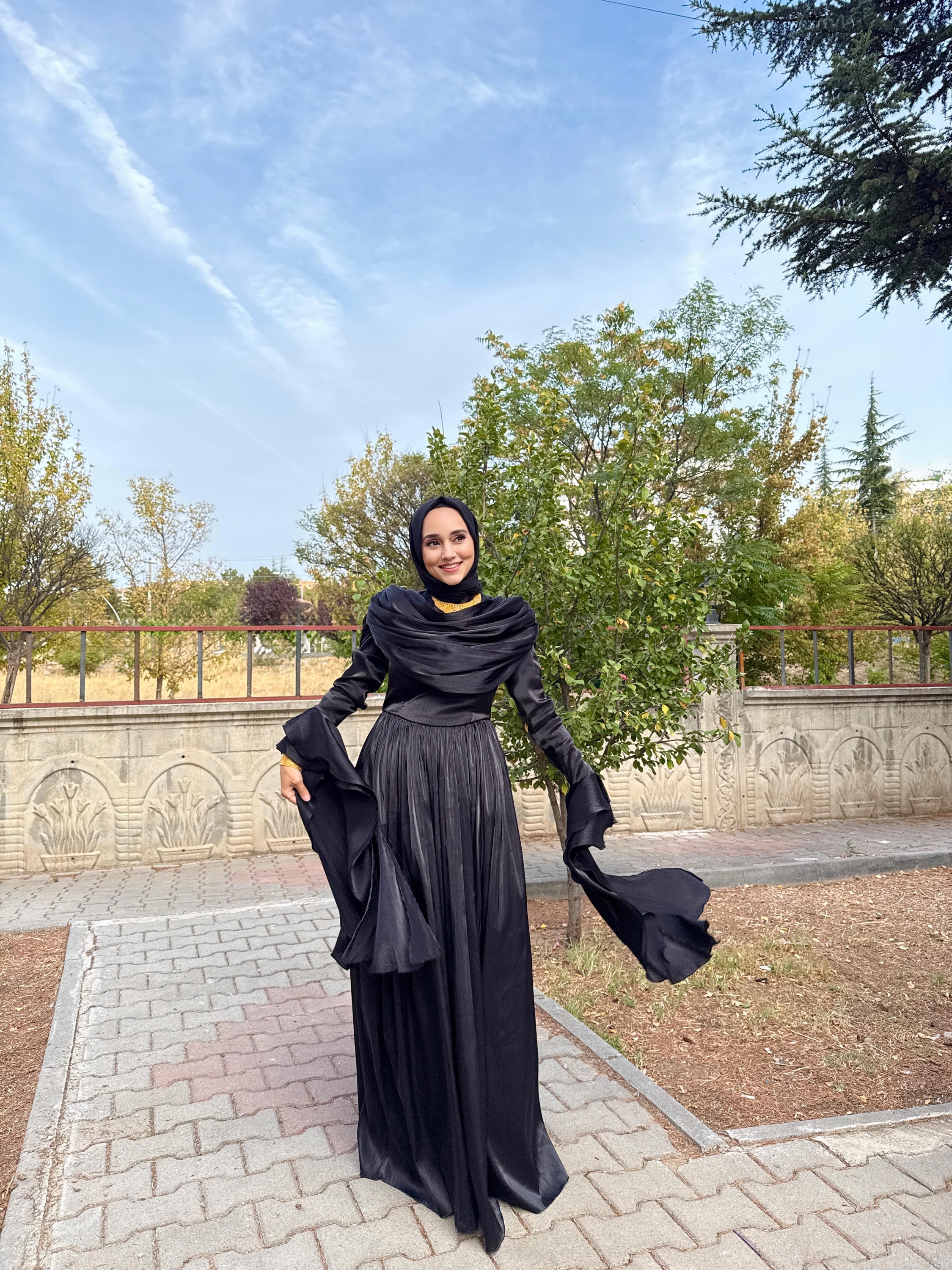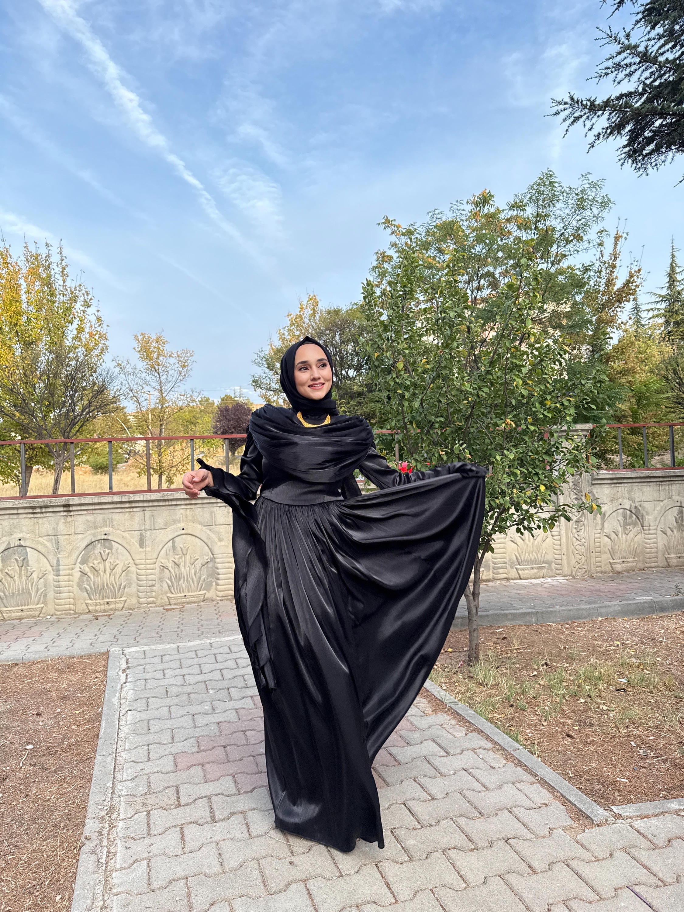 Yumuşak şifon kumaşı, ışıltılı dokusuyla ışığı zarifçe yansıtır.; Uzun kollu tasarımı ve tam kapalı yapısıyla tesettür uyumuna sahiptir.;