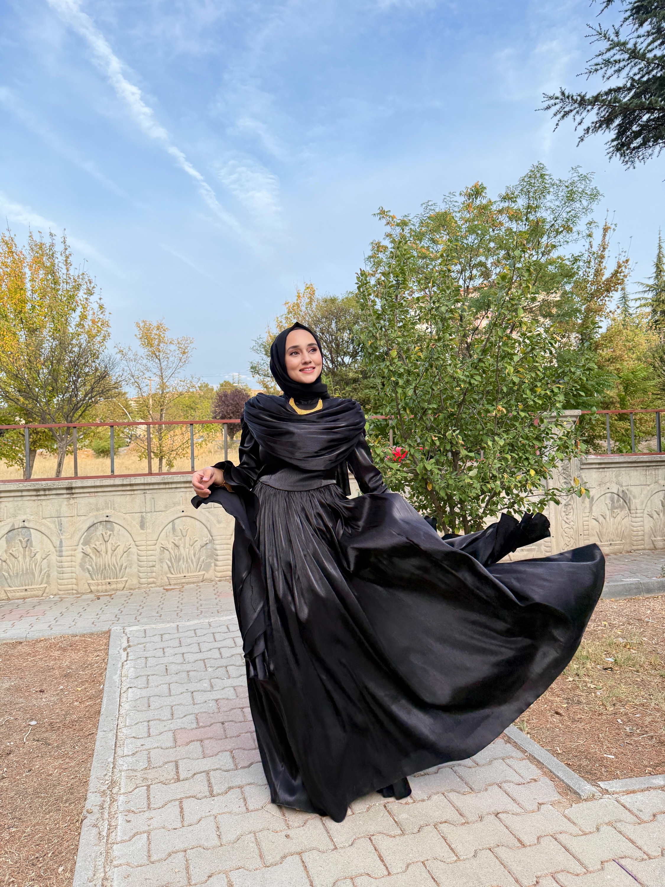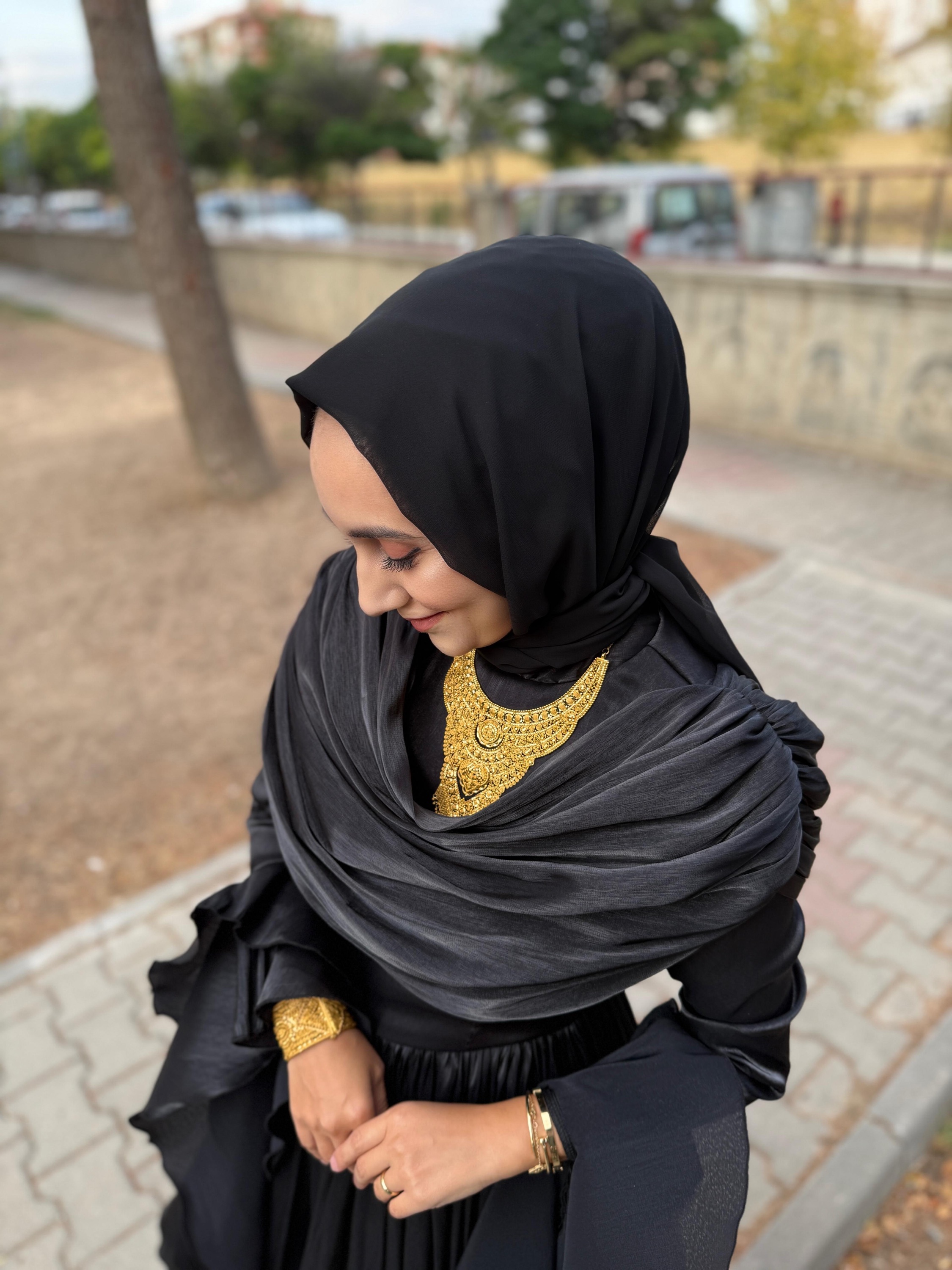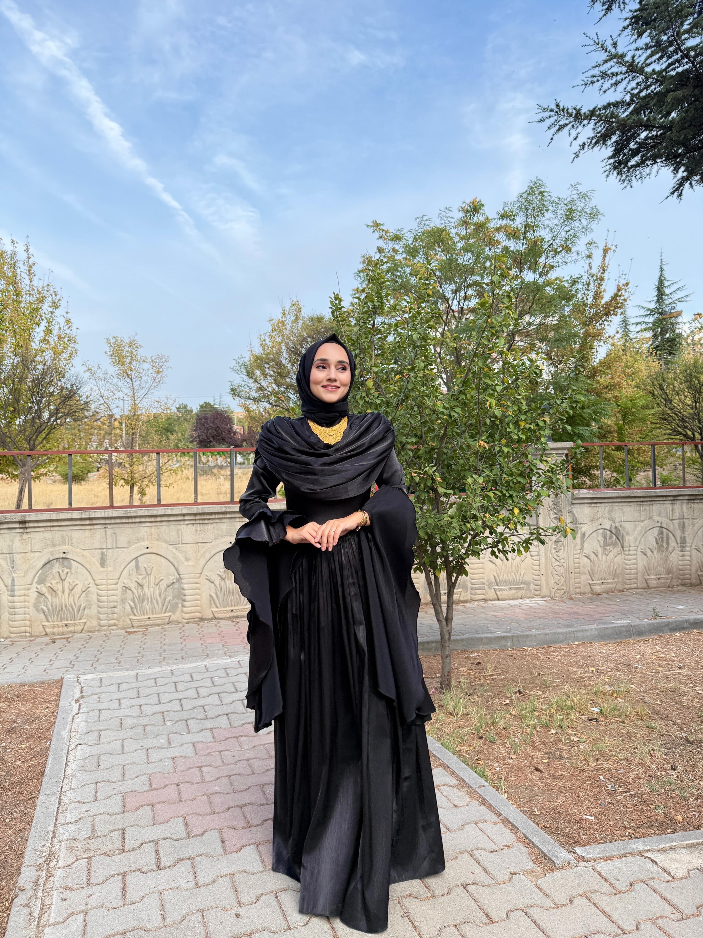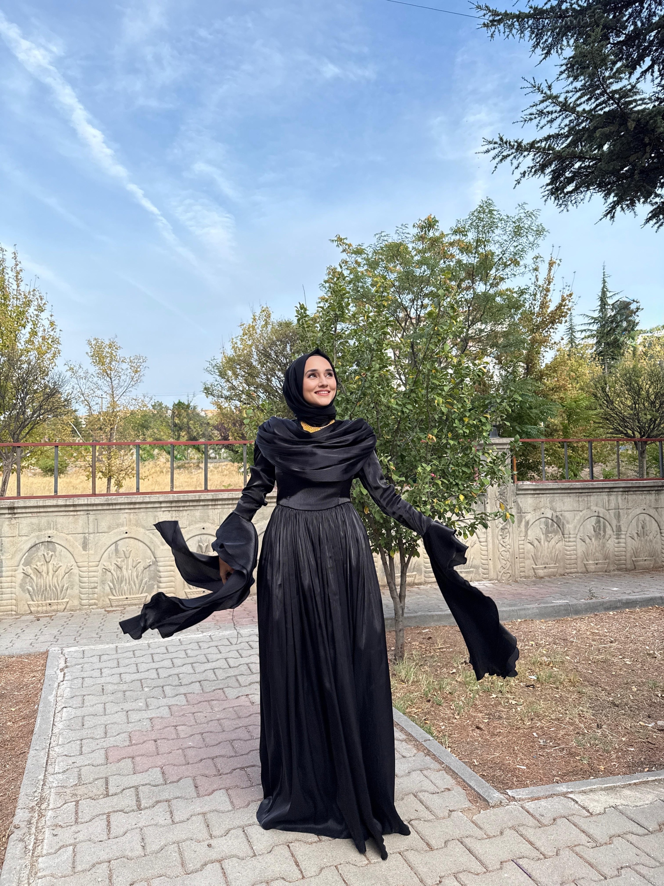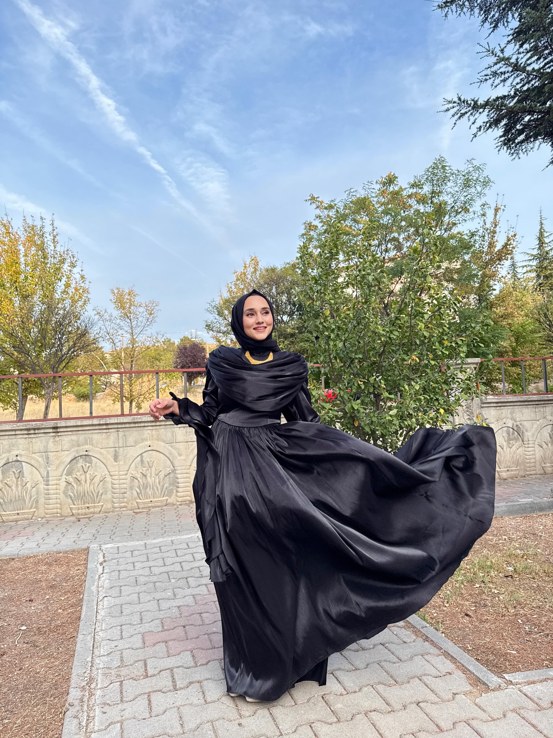 Yumuşak şifon kumaşı, ışıltılı dokusuyla ışığı zarifçe yansıtır.; Uzun kollu tasarımı ve tam kapalı yapısıyla tesettür uyumuna sahiptir.;