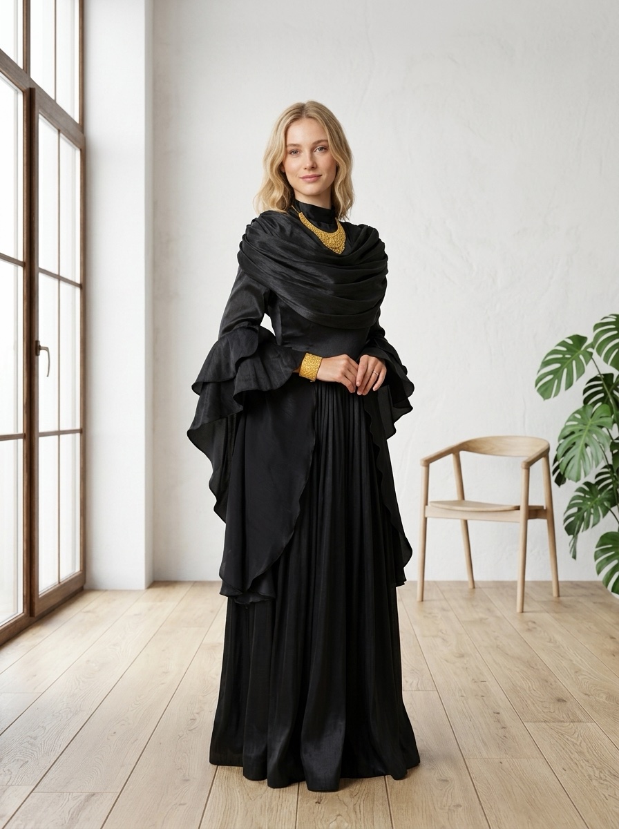 Siyah tonlarının doğal şıklığı ile buluşuyor.; Drape detaylı yakası ve volanlı kolları , vücuda nazikçe oturaran feminen bir siluet sunan kalıbı ile; dökümlü etek formu özel davetlerde göz alıcı bir duruş sağlar.;
