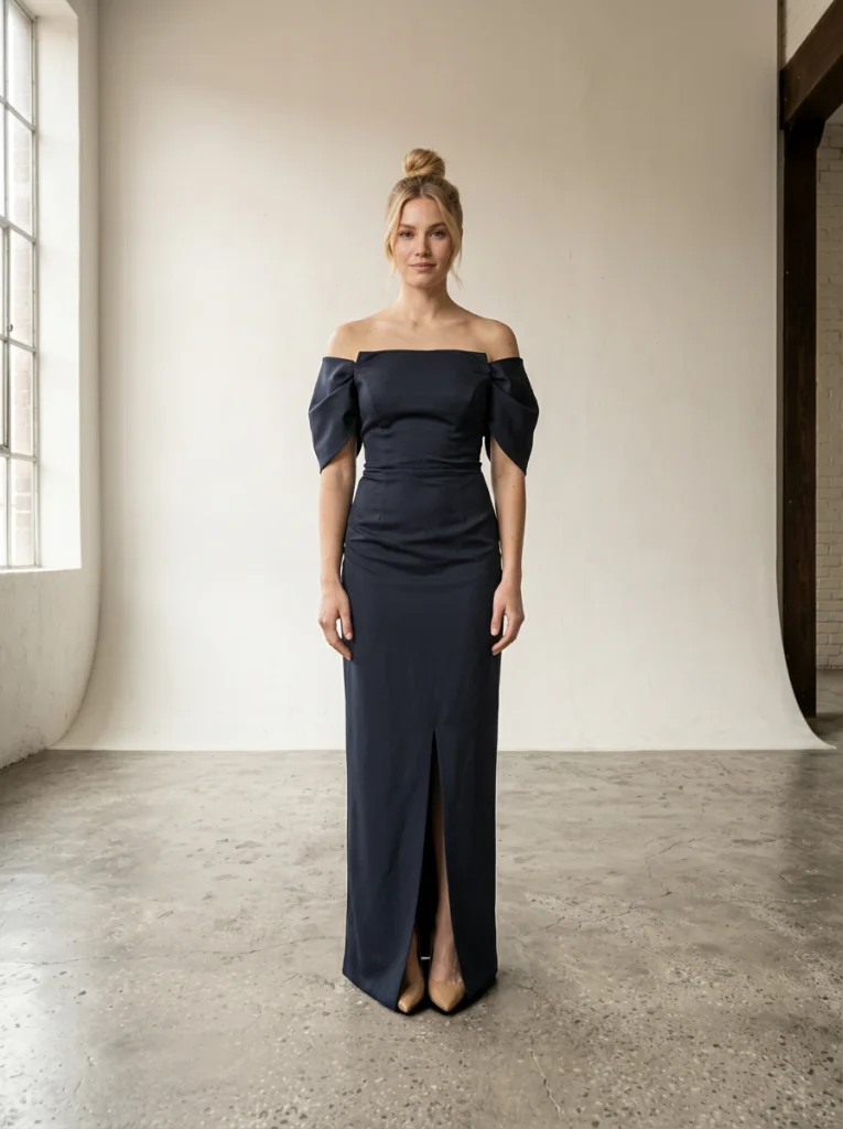 Bu abiye elbise, siyah saten kumaşın ışıltılı dokusuyla her adımınızda fark yaratmanız için tasarlandı. Omuz açık kesimi yaka hattınızı zarif bir çerçeveyle öne çıkarırken, özenle yerleştirilmiş dekolte detayı feminen ve sofistike bir görünüm sunar.