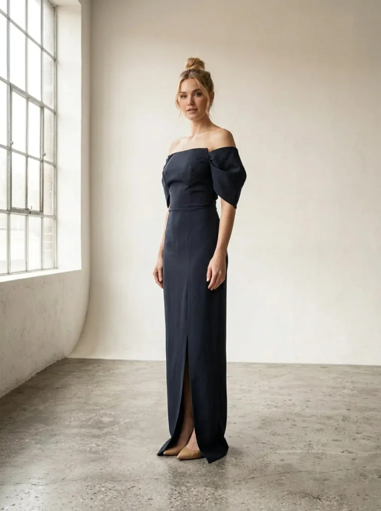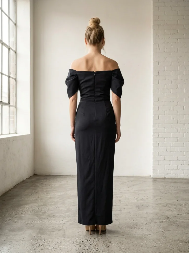 Siyah Saten Abiye Elbise — Omuz Açık Dekolte Detaylı Yırtmaçlı Uzun Tasarım