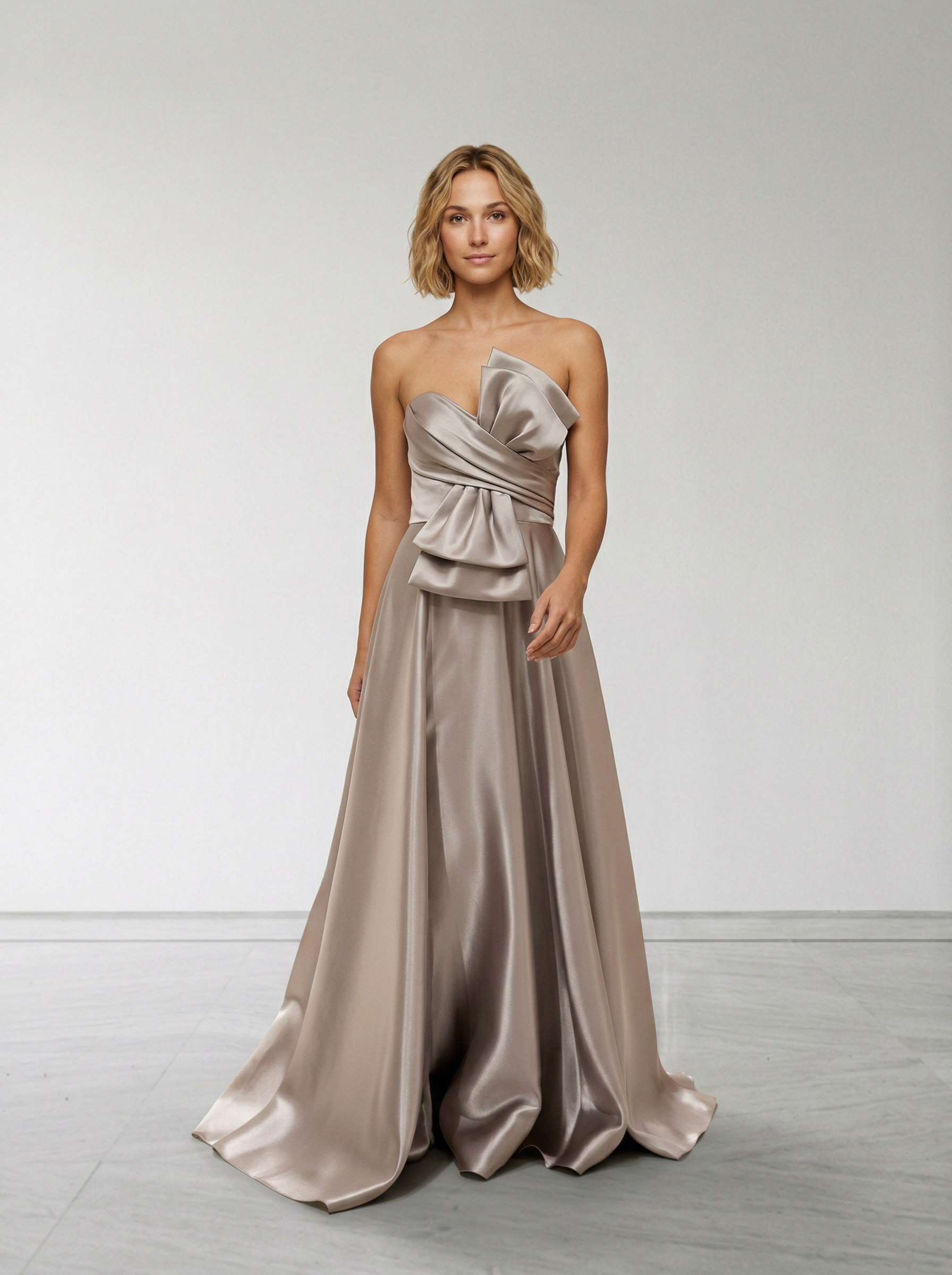 Bu elbise, tek bir detayla tüm kuralları yeniden yazıyor. Büyük fiyonk, tasarımın kalbi — dramatik ölçeğiyle elbiseye couture karakteri kazandırırken, vizon tonunun sakin ve sofistike yapısı bu cesareti dengeleyerek kusursuz bir uyum yaratır.