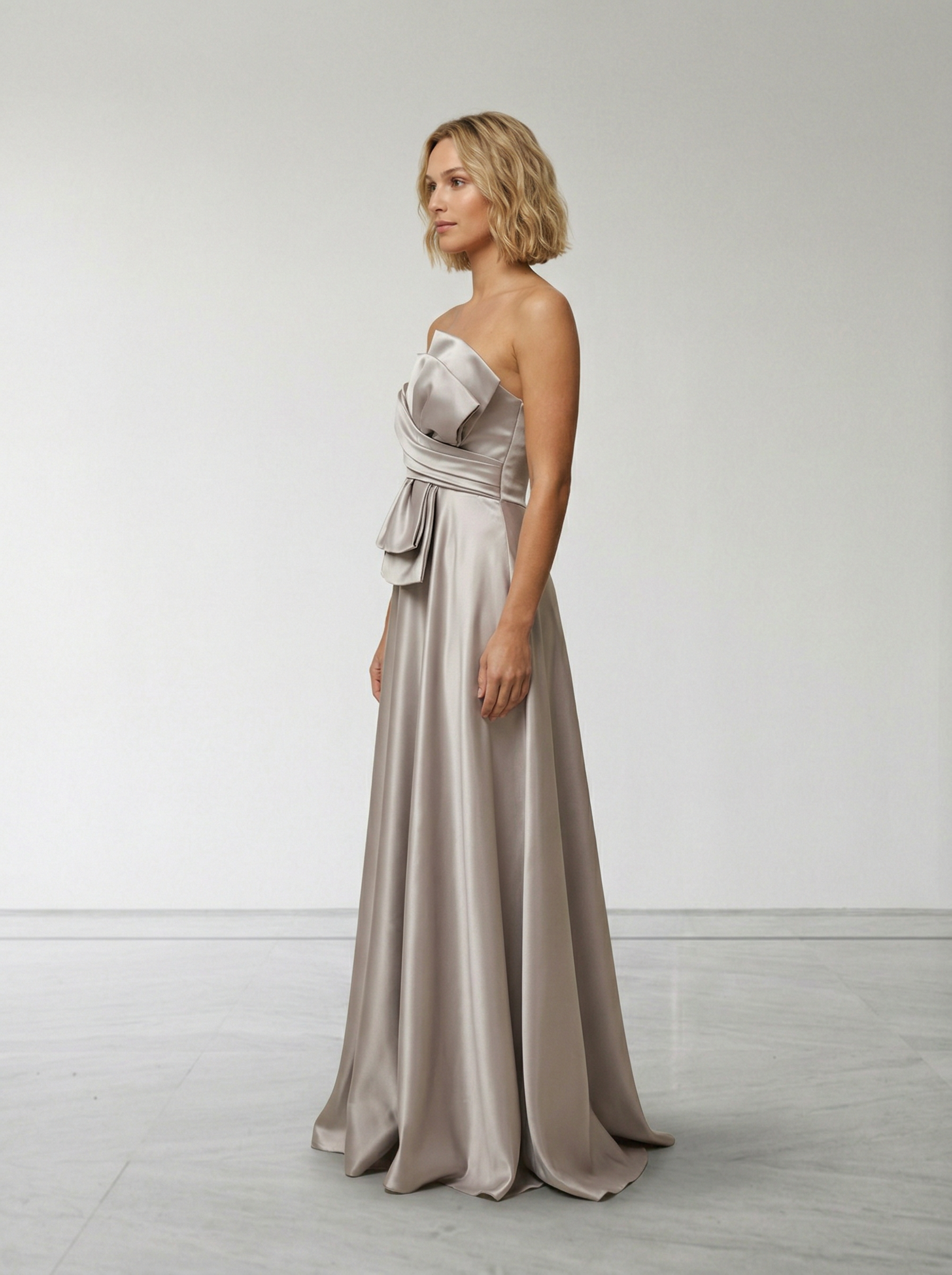 Straplez kesim omuz ve dekolte hattını zarif bir çerçeveyle öne çıkarırken, yırtmaç detayı yürüyüşe akıcı bir hareket ve feminen bir enerji katar. Vizon rengi ten tonlarıyla mükemmel uyum sağlar, hem sıcak hem soğuk cilt tonlarını aydınlatır ve fotoğraflarda olağanüstü bir derinlik verir.