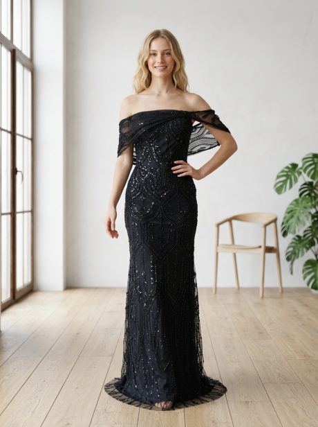 Büyük Beden Siyah Krep Kumaş Büyük Beden İşlemeli Anne Abiyesi – Şık Davet Elbisesi