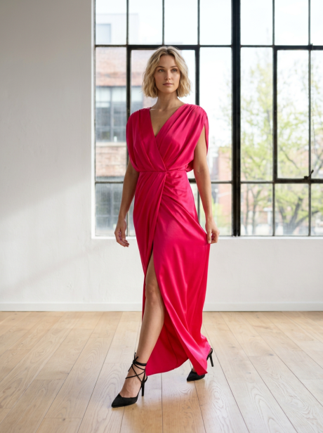 Fuşya Drapeli Abiye Elbise — Vatkalı Omuz Detaylı Şık Tasarım