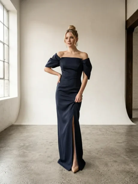 Siyah Saten Abiye Elbise — Omuz Açık Dekolte Detaylı Yırtmaçlı Uzun Tasarım