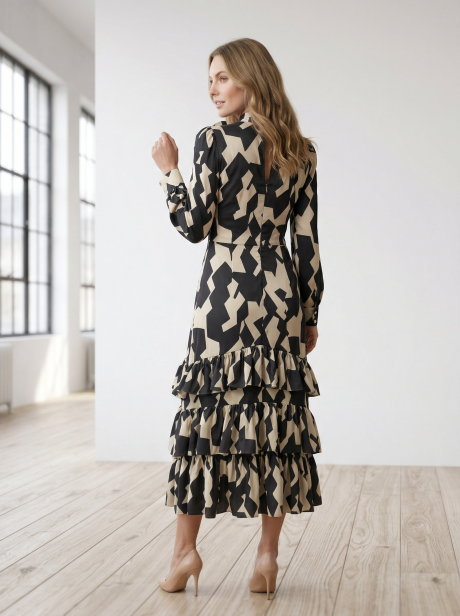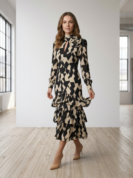 Desenli Midi Elbise — Eteği Fırfır Detaylı Şık Günlük Tasarım